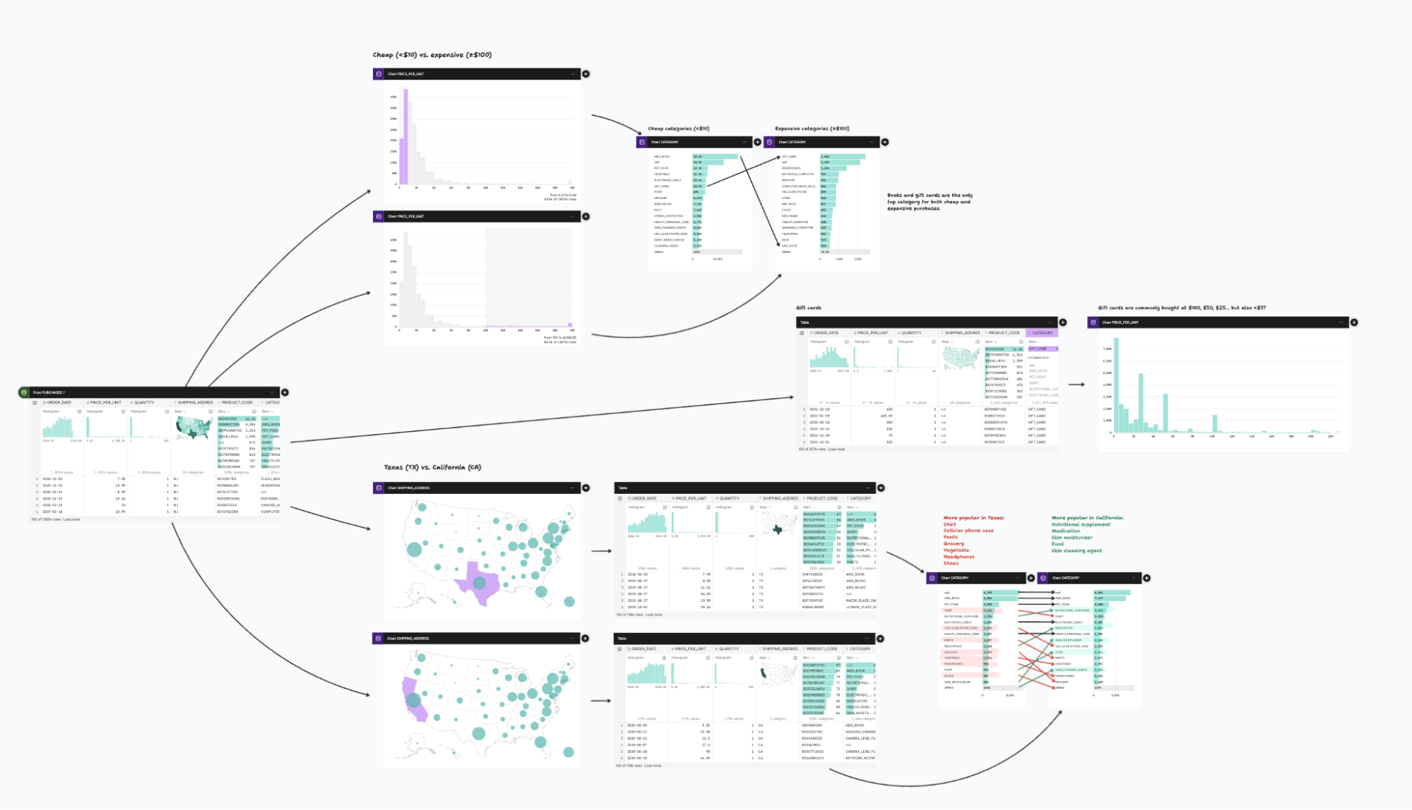 Too often, today’s tools don’t proactively surface visual summaries, instead requiring the analyst to spot check manually. Too often, tools force a linear workflow that penalizes experimentation and flattens thinking. And too often, tools don’t capture the messy context and thinking around analysis, leading to results that don’t communicate.