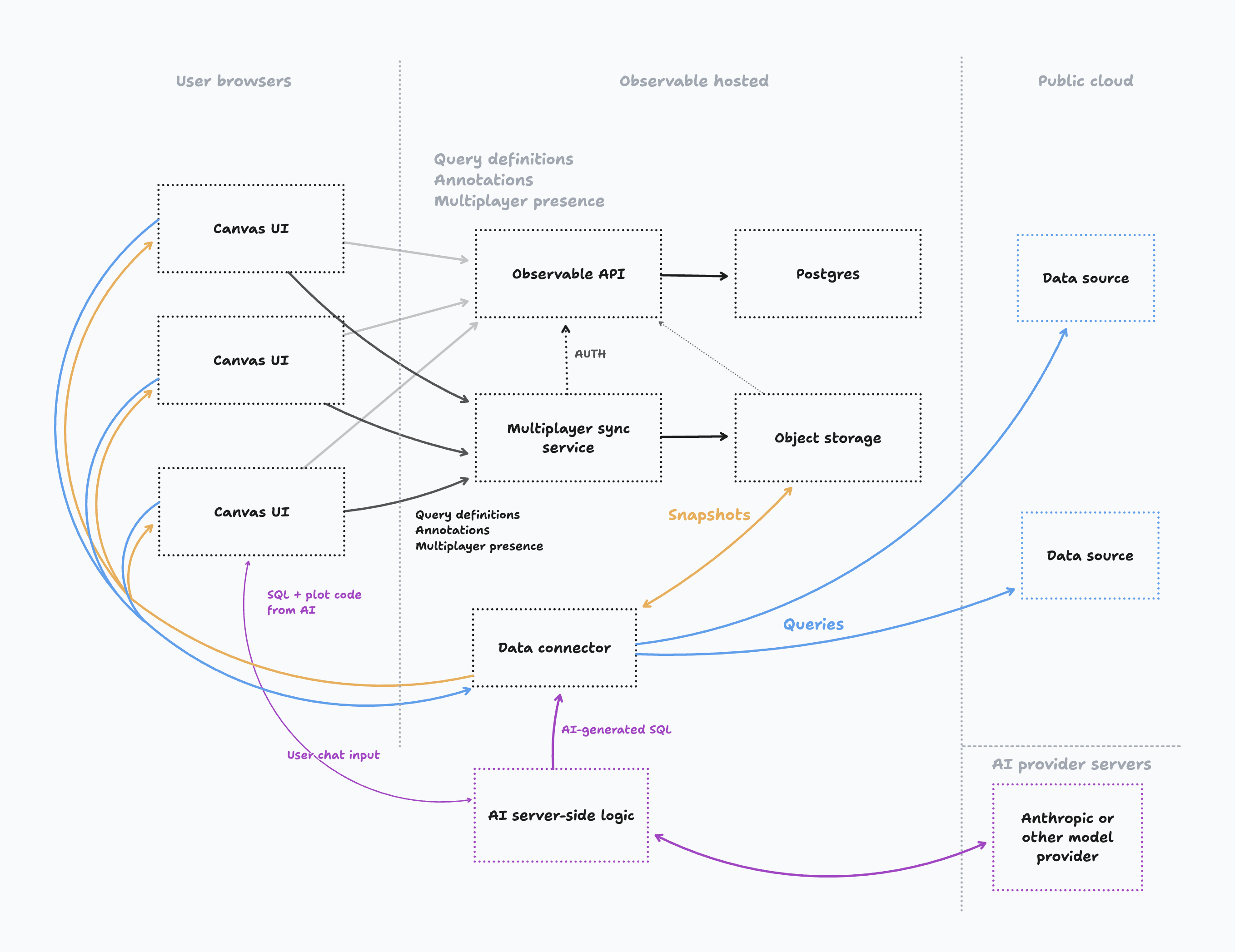 To query remote data sources, Observable hosts a data connector; this data connector receives requests from browsers and issues a corresponding query on the corresponding data source; query results are then returned to the browser for display, and typically also persisted as query snapshots in Observable-hosted object storage. Query snapshots ensure that what you see on the canvas is consistent over time and between viewers.