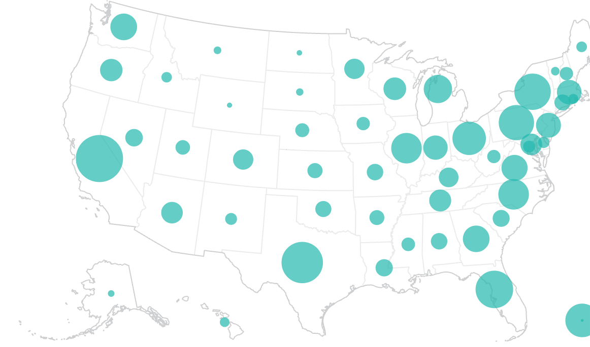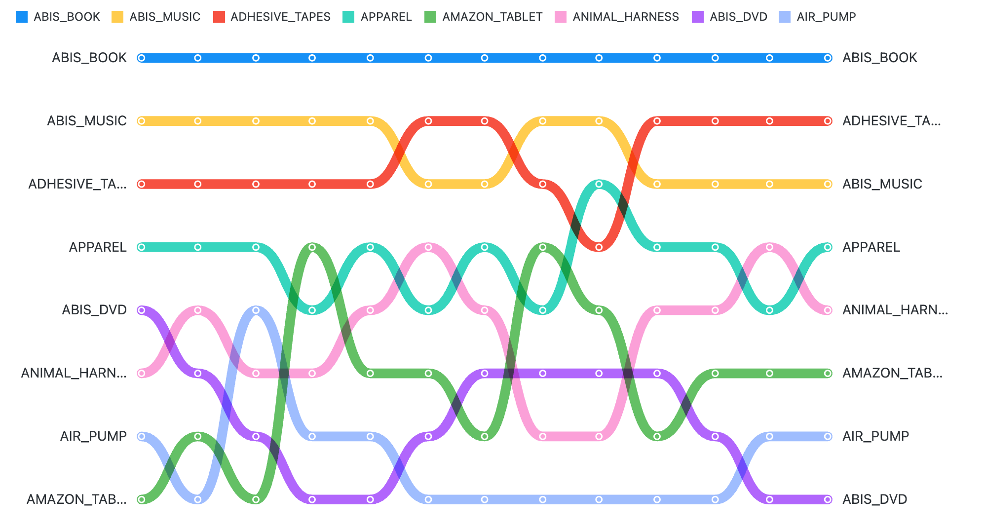 Series charts connect points from one date to the next so you can see trends over time. Area charts and streamgraphs can be broken down into stacked colors so you can see one segment’s contribution to the whole. Bump charts show relative rank on the y axis instead of quantitative values.
