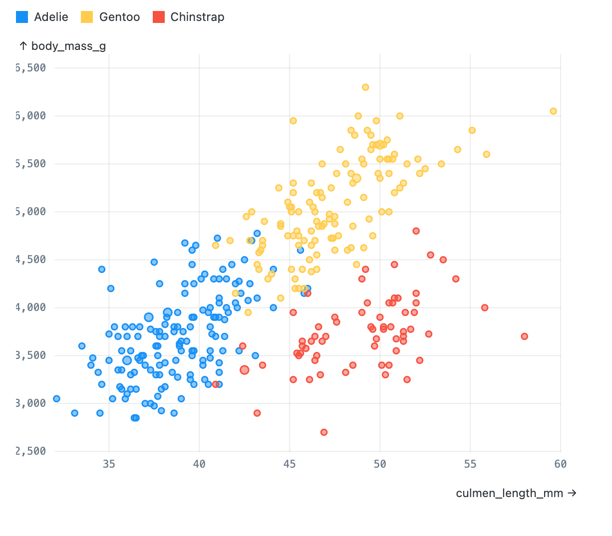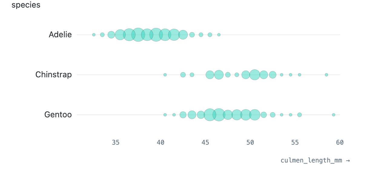 Point charts represent data points by circles positioned and sized proportional to the data. Scatterplots have two numeric axes; dot plots have one numeric and one categorical axis; beeswarms have a numeric x axis and use the y axis just to spread out to prevent occlusion among points.