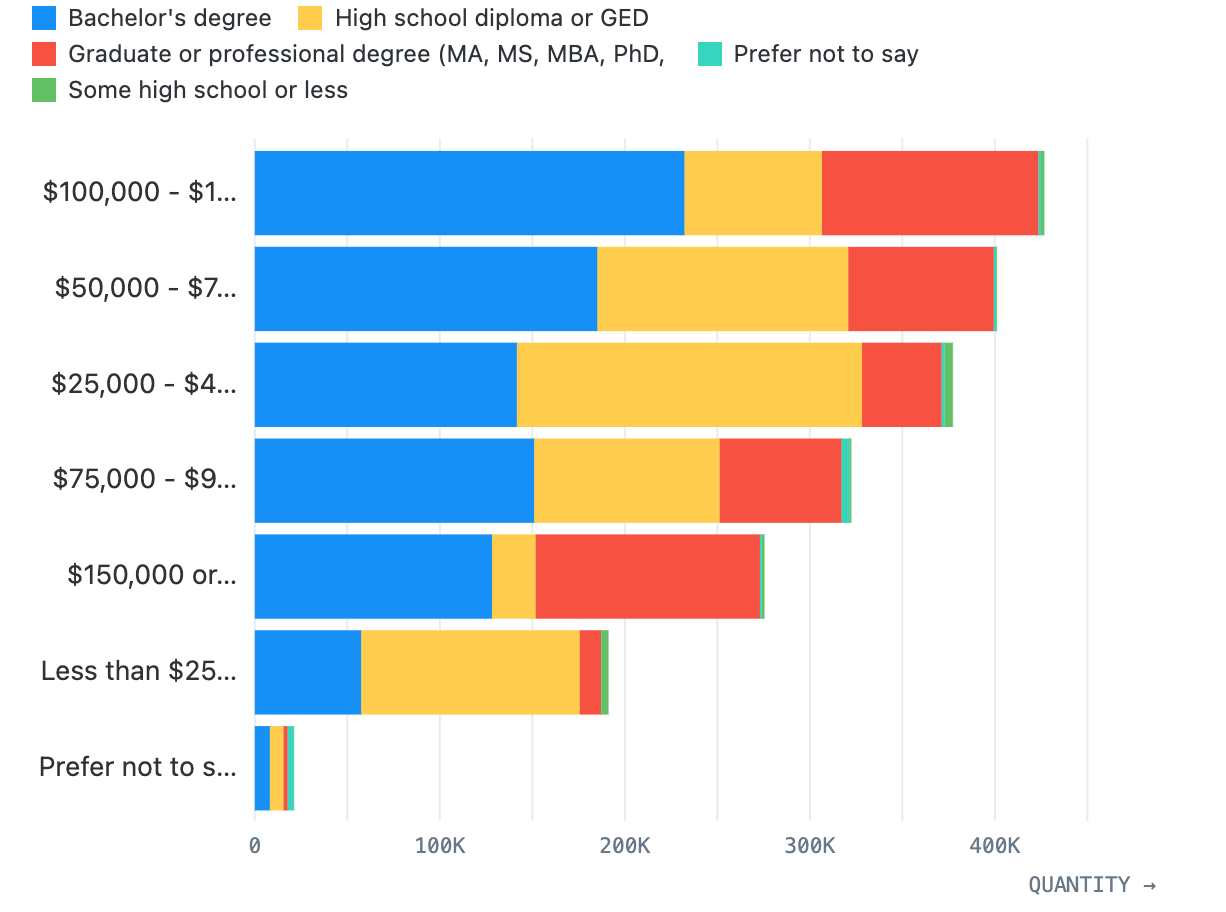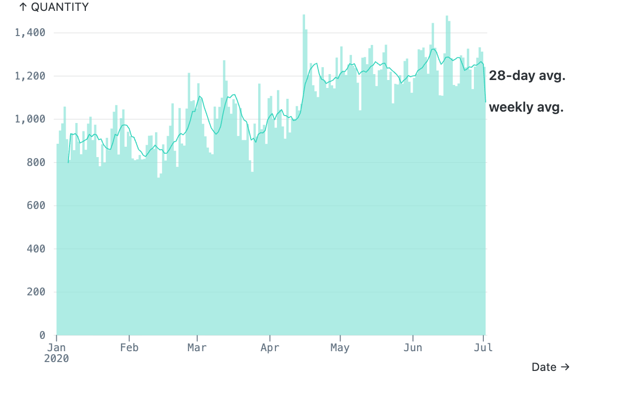 Bar charts generally represent the distribution of some quantity over time, over categories, or over another quantity. Bars and columns have stacked variants for breaking the bars up by color. The temporal type supports rolling average overlays.