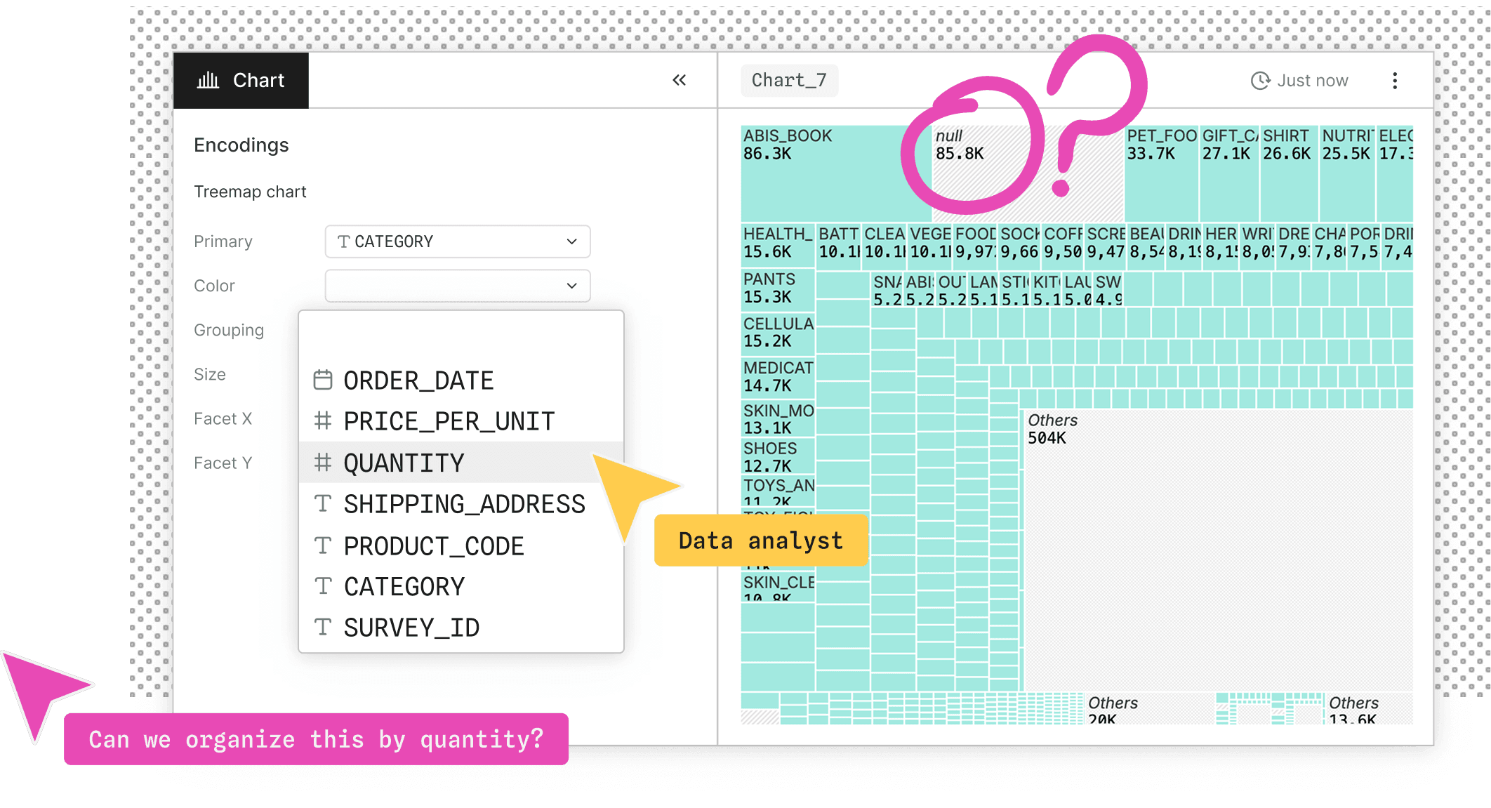 Fluidly switch between performant visualizations — from bar charts to Sankey diagrams — that automatically handle edge cases like outliers.